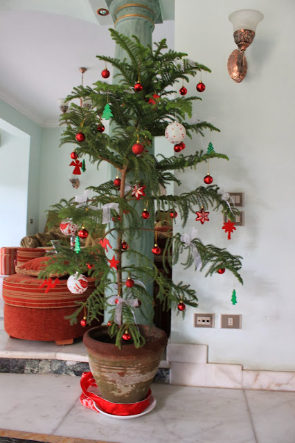 Kurz vor unserer Weihnachtsreise in die geliebte deutsche Heimat haben wir uns hier noch schnell einen kleinen Christbaum aufgestellt. Leider gibt es in Ägypten keine Tannen, dafür schöne Palmen! Das für Kugeln am besten geeignete Grünzeug ohne Namen wurde gekauft und zuhause mit großer Freude von den Kids mit den ägyptischen (noch ertragbaren) Kitschkugeln geschmückt. Hauptsache Plingpling! *grins*