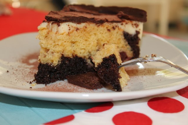 Buttercreme mögen wir nicht so gerne, daher gibt es bei uns immer nur einen ganz normalen Vanillepudding als Belag. Da ich hier noch keine erträgliche Schokoglasur gefunden habe (schmecken alle völlig parfümiert), wurden kurzer Hand 2 Tafeln Zartbitterschokolade mit einem Schuss Sahne geschmolzen. Et voilà...